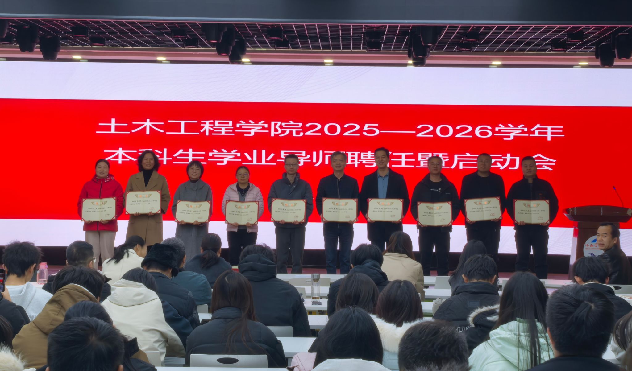 会议宣布了《土木工程学院学业导师制工作实施细则》,强调了导师的工作职责与要求,明确了各年级学业导师的具体工作安排。同时,学院负责人为23位学业导师颁发了聘书。