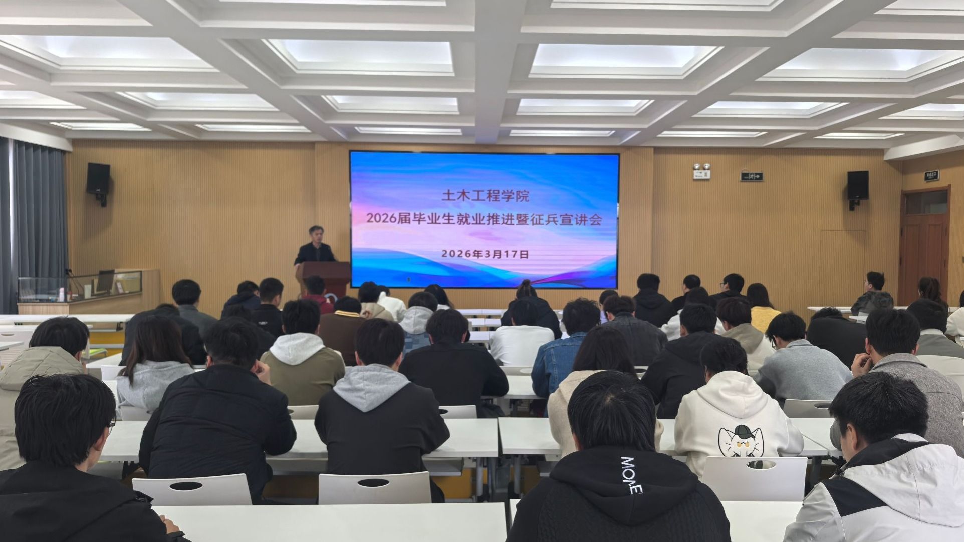 3月17日,土木工程学院召开全体毕业生就业推进暨征兵会议,学院领导班子成员、全体辅导员、2026届毕业班班主任及全体毕业生代表参会。